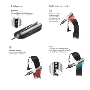 علاوه بر این، Airstrait HT01 به قابلیتهای هوشمند دیگری نیز مجهز است. دستگاه دارای یک نمایشگر LCD رنگی است که به شما اجازه میدهد حالت کارکرد (Wet یا Dry)، سطح حرارت و سرعت جریان هوا را به آسانی مشاهده و تنظیم کنید. همچنین، برای صرفهجویی در انرژی و افزایش ایمنی، دستگاه مجهز به قابلیت مکث خودکار (Auto-Pause) است؛ به محض رها کردن دستگاه روی میز کار، جریان هوا متوقف میشود و با برداشتن دوباره آن، فوراً آماده کار میشود. اتو مو سشوار دایسون Airstrait با ترکیب این نوآوریهای بینظیر، نه تنها تجربه صاف کردن مو را دگرگون میکند، بلکه به شما کمک میکند تا موهایی سالمتر، قویتر و زیباتر داشته باشید و با اطمینان کامل، از سلامت و درخشندگی موهای خود لذت ببرید. این دستگاه، انتخابی هوشمندانه برای کسانی است که به دنبال کارایی، سرعت و در عین حال، حفاظت حداکثری از موهای خود هستند.