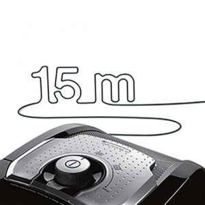 طول کابل این جاروبرقی حدود ۱۲ متر است که با احتساب طول لوله و بدنه، شعاع عملکردی حدود ۱۵ متر فراهم میکند. این میزان به شما اجازه میدهد تا حتی فضاهای بزرگتر را بدون نیاز به جابجایی مداوم دستگاه یا تعویض پریز برق، جارو کنید. همچنین سیمجمعکن اتوماتیک با عملکرد نرم و بدون گیرکردن، یکی از مزایای کاربردی آن است.