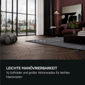 یکی از نقاط قوت بزرگ طراحی VX9، چرخهای بزرگ و نرم آن است. این چرخها با روکشی سیلیکونی طراحی شدهاند تا هنگام حرکت روی پارکت، سنگ یا فرش، خط نیندازند و کاملاً بیصدا حرکت کنند. چرخها همچنین دارای قابلیت چرخش ۳۶۰ درجه هستند که جابهجایی را فوقالعاده روان میکند.