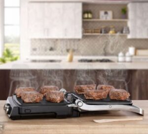 یکی از قابلیتهای جذاب دیگر در این مدل، درپوش متحرک با قابلیت باز شدن ۱۸۰ درجه است که میتوان از آن هم بهصورت گریل بسته (برای فشردن و گریلکردن ساندویچ یا استیک) و هم بهصورت باز شده کامل مانند یک باربیکیو رومیزی استفاده کرد. در این حالت، سطح پخت دو برابر میشود و میتوان حجم بیشتری از غذا را همزمان آماده کرد. این ویژگی برای مهمانیها، پیکنیکها و آشپزی دستهجمعی فوقالعاده کاربردی است.
