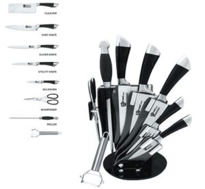 در این سرویس کاربردی، پنج نوع چاقوی مختلف شامل چاقوی سرآشپز، چاقوی ساطوری، چاقوی نان، چاقوی همهمنظوره و چاقوی میوهخوری وجود دارد. همچنین یک عدد قیچی آشپزخانه، یک تیزکن دستی، یک پوستکن و پایه نگهدارنده چرخان نیز در این ست قرار گرفتهاند. پایه چرخان اکریلیک شفاف علاوه بر ظاهر مدرن، دسترسی آسان به چاقوها را نیز فراهم میکند.