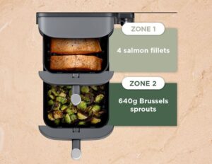 یکی از نقاط قوت عملکرد DualZone، قابلیت تنظیم مستقل دما و زمان برای هر یک از محفظههاست. این یعنی اگر یک غذا نیاز به دمای ۲۰۰ درجه و زمان ۲۰ دقیقه دارد و غذای دیگر باید در ۱۶۰ درجه و ۱۵ دقیقه پخته شود، دستگاه بهطور هوشمندانه این تفاوت را مدیریت میکند.